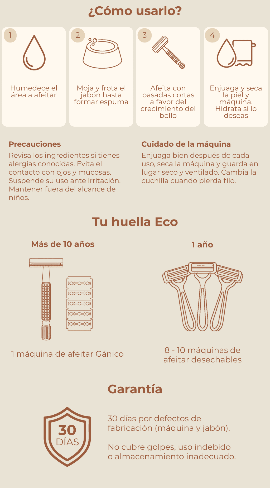 30 días por defectos de fabricación (máquina y jabón). No cubre golpes, uso indebido o almacenamiento inadecuado.